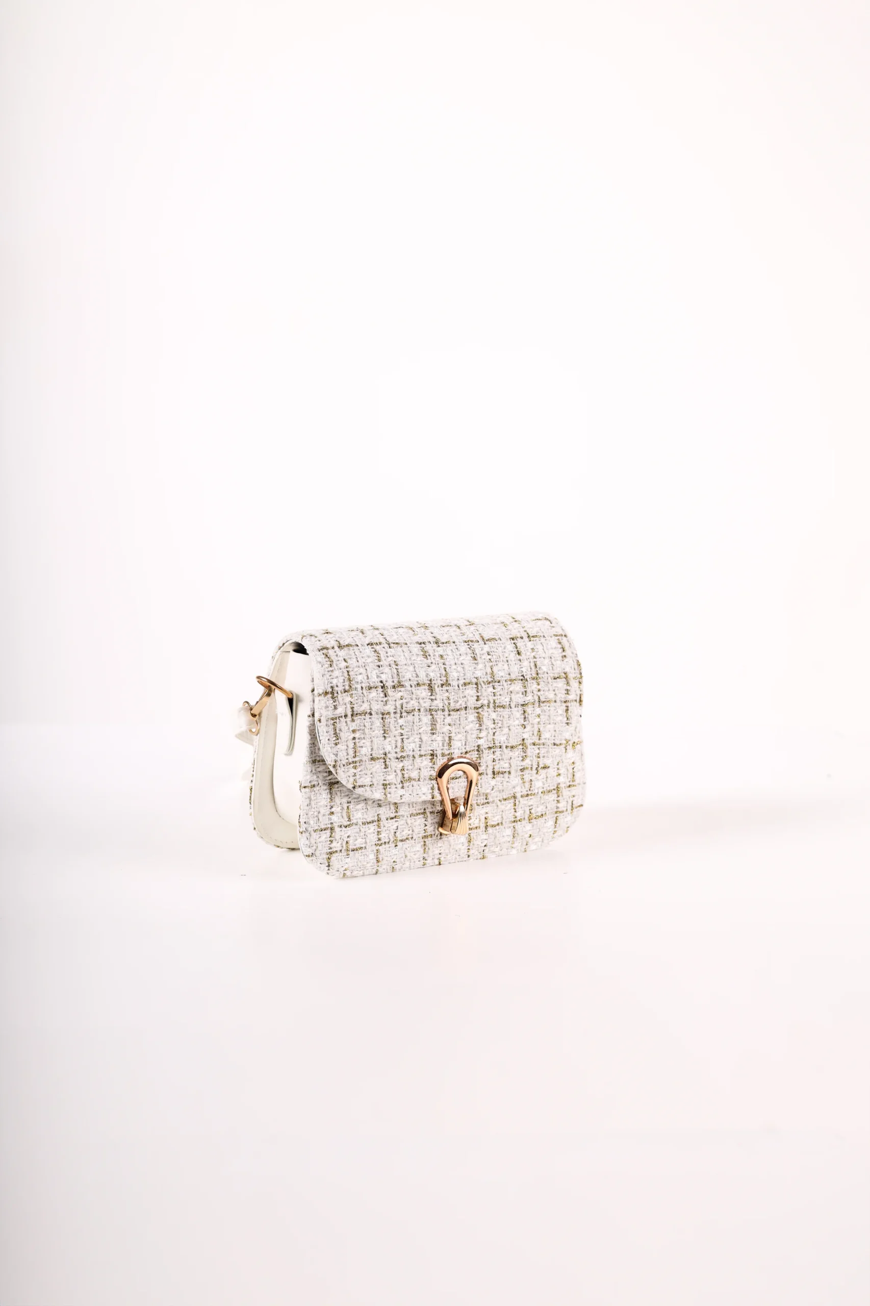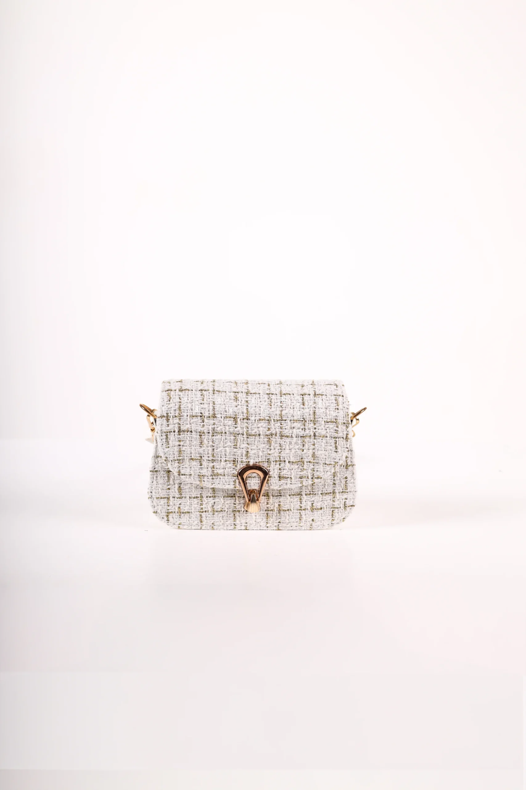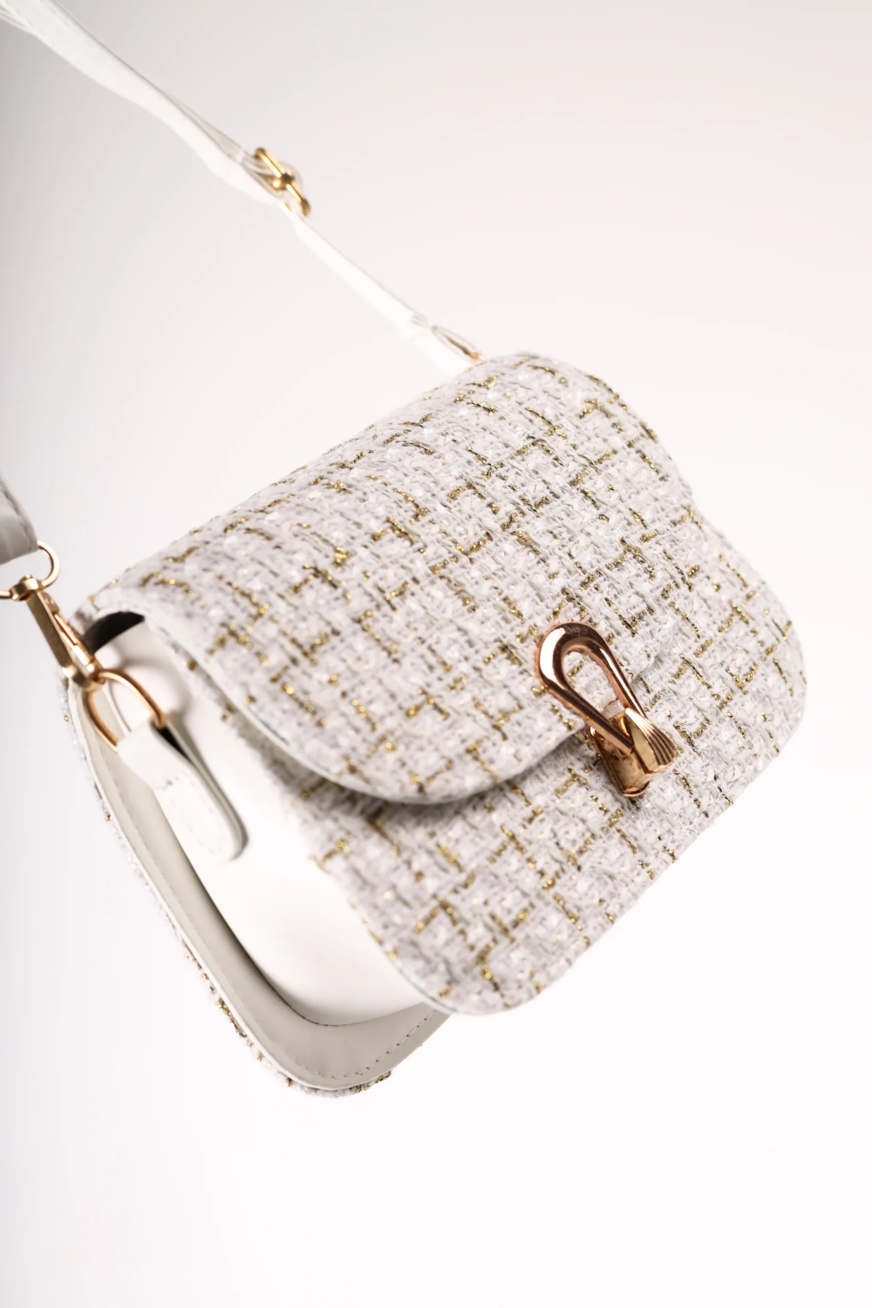 Ova prefinjena torbica dimenzija 19x13x7 cm spaja klasičnu belu boju sa modernim tvid materijalom, stvarajući elegantan dodatak koji se ističe svojom teksturom i stilom. Kombinacija čvrstog tvida i poliuretana pruža torbici postojan oblik i vizuelnu dubinu, dok zlatni detalji dodaju notu luksuza.